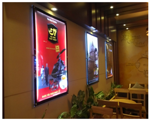- Làm biển hộp đèn siêu mỏng nắp hít chuyên dùng để ốp tường nhà hàng, khách sạn, salon tóc, quán cà phê, cầu thang máy và làm poster quảng cáo trong nhà. Đối với không gian kinh doanh nhỏ hẹp, làm biển hộp đèn siêu mỏng nắp hít sẽ là một lựa chọn rất đáng cân nhắc.